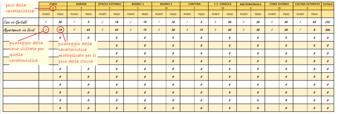 Per ogni immobile che andrai a visitare, stabilisci che punteggio dai per ciascuna delle categorie che hai individuato in una scala da 1 a 5 (dove 1 è il minimo e 5 il massimo), moltiplicale per il peso che hai dato a ciascuna delle singole voci e fai la somma di tutti i punteggi parziali. La casa che riceverà il punteggio più alto sarà quella da preferire.