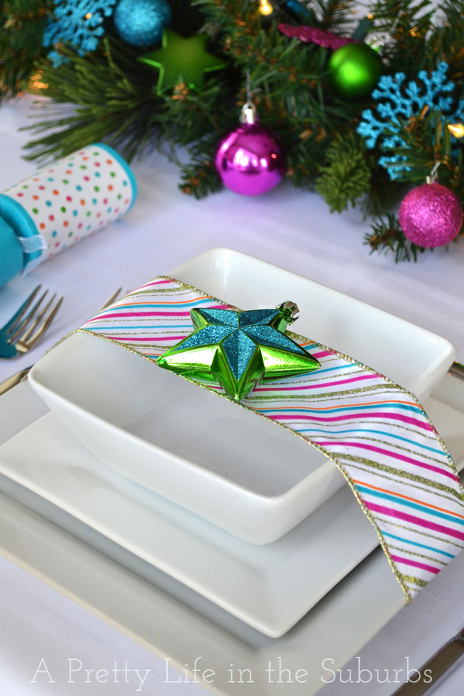 di lacasaimperfetta 11 dicembre 201811 dicembre 2018 Natale_Colourful-Christmas-Table-Setting-14A-Pretty-Life Dettaglio tavola colorata con piatti in ceramica bianca, nastro multicolore e stella verde e blu